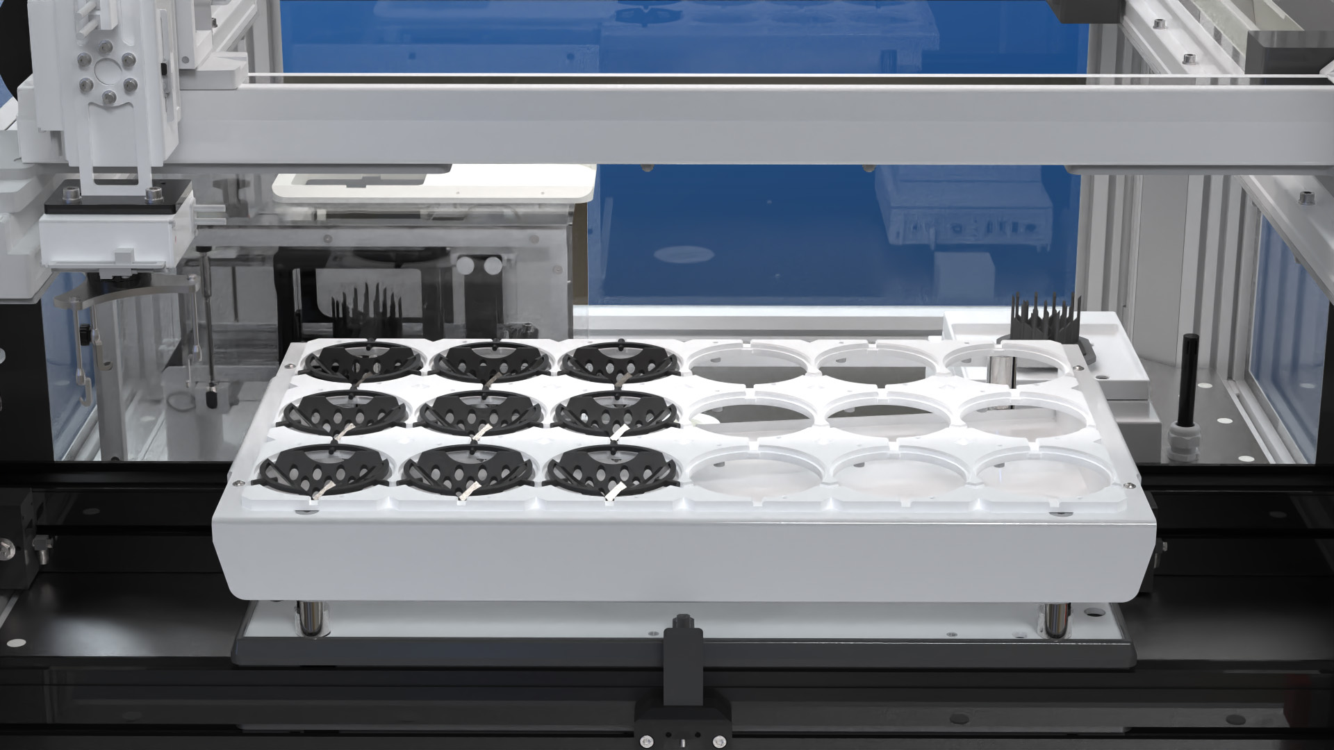 Dimensionics Density’s density determination technology elevates the classic Archimedes principle to new heights of precision, speed, and repeatability through the integration of advanced automation technology. The density determination process is meticulously designed for maximum accuracy. Samples are carefully placed within an innovatively crafted component carrier, featuring strategically positioned openings for measurement precision. These carriers glide through the system, guided by a robotic arm that ensures central and exact placement onto the vibration-insulated scales.A specialized lift-out rack equipped with pins resides on the scales, adeptly raising the sample out of the carrier, allowing for an unobstructed weighing process. This automation is key, consistently eliminating the variable of human error and guaranteeing uniform placement on the scales every time. Complementing this precision hardware, the system is armed with climate sensors that monitor and record every nuance of the environment –temperature, air pressure, and water temperature. These readings are not merely observed they are integrated into a sophisticated evaluation algorithm, ensuring that each density measurement is corrected for ambient conditions, delivering results with uncompromising accuracy. Of key importance is that the process is designed to be used in busy production settings, not in the lab.
