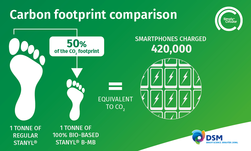 Stanyl B-MB – now available with up to 100% bio-based content – is a fully ISCC+-certified mass-balancing solution, and delivers exactly the same characteristics, performance, and quality as conventional Stanyl. In addition, production of Stanyl B-MB now generates a carbon footprint up to 50% lower than the fossil-based original. In practice, this means a 3.3-ton CO2 reduction per ton produced – equivalent to charging 420,000 smartphones. Not only does this industry first further support the ‘Sustainable sourcing’ pillar of DSM Engineering Materials’ SimplyCircular™ initiative, but it also raises the bar for biomass-balanced solutions in the industry. DSM Engineering Materials therefore continues to lead the way on driving carbon-footprint reductions and boosting customers’ environmental success.